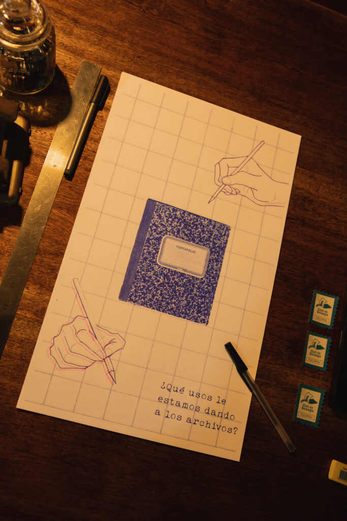 Dispusimos tres formatos de papel, de distintos tamaños, para ser intervenidos: uno grande, destinado a una escritura colectiva, con la pregunta “¿Qué usos le estamos dando a los archivos?”; uno tamaño carta, en papel roneo, cuyo encabezado decía “¿Qué archivos faltan por construir?”; y otros más pequeños, orientados a la introspección: “¿Qué nos atrae y qué nos inquieta de los archivos?”.