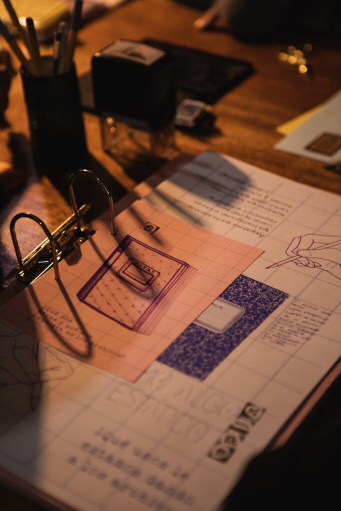“El punto de partida serán los materiales”, afirmamos en nuestras reuniones. El punto de partida es el tacto, el cuerpo interactuando con materiales simples y comunes. Una resma de papel, lápices que evocan el colegio y conectan con la infancia, timbres que detonan conversaciones sobre momentos del pasado; una brecha que se convierte en puente cuando una mujer le enseña a un adolescente a usar una máquina de escribir. Las manos tocan la mesa, doblan papeles, se ensucian los dedos con tinta y recuerdan con firmeza ese timbre que usaban en los 80. Los ojos jóvenes se sorprenden de lo rudimentario de nuestros elementos, mientras las almas viejas celebran la posibilidad de escribir a mano.